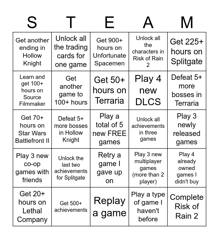 This bingo card has a free space and 24 words: Unlock the last two achievements for Splitgate, Get 500+ achievements, Get 50+ hours on Terraria, Get 20+ hours on Lethal Company, Get 225+ hours on Splitgate, Get another ending in Hollow Knight, Learn and get 100+ hours on Source Filmmaker, Unlock all the trading cards for one game, Unlock all achievements in three games, Retry a game I gave up on, Play 4 new DLCS, Get 70+ hours on Star Wars Battlefront II, Play 3 new multiplayer games (more than 2 player), Play 4 already owned games I didn't buy, Get another game to 100+ hours, Play a type of game I haven't before, Play 3 newly released games, Get 900+ hours on Unfortunate Spacemen, Defeat 5+ more bosses in Terraria, Defeat 5+ more bosses in Hollow Knight, Complete Risk of Rain 2, Play 3 new co-op games with friends, Unlock all the characters in Risk of Rain 2 and Replay a game.