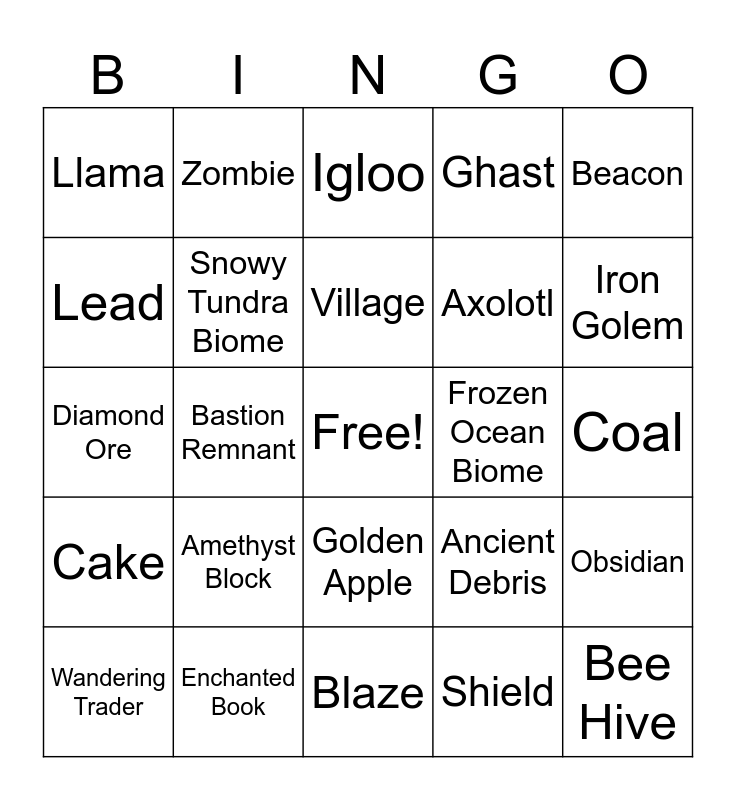 This bingo card has a free space and 71 words: Creeper, Zombie, Skeleton, Enderman, Blaze, Wither Skeleton, Ghast, Piglin, Axolotl, Glow Squid, Wandering Trader, Armadillo, Iron Golem, Llama, Drowned, Diamond Ore, Ancient Debris, Beacon, Lodestone, Coal, Amethyst Block, Bee Hive, Obsidian, Soul Sand, Redstone Ore, Iron Ore, Moss Block, Scaffolding, Netherite Block, Crying Obsidian, Enchanted Book, Potion of Healing, Netherite Sword, Crossbow, Shield, Fishing Rod, Trident, Saddle, Lead, Totem of Undying, Golden Apple, Name Tag, Cake, Desert Biome, Jungle Biome, Plains Biome, Savanna Biome, Snowy Tundra Biome, Deep Dark Biome, Badlands Biome, Swamp Biome, Dripstone Caves Biome, Frozen Ocean Biome, Lush Caves Biome, Mushroom Fields Biome, Mangrove Swamp Biome, Village, Pillager Outpost, Stronghold, End City, Nether Fortress, Woodland Mansion, Bastion Remnant, Ocean Monument, Desert Temple, Jungle Temple, Igloo, Ruined Portal, Mineshaft, Shipwreck and Ancient City.