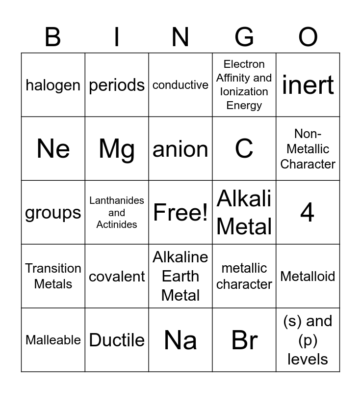 This bingo card has 2 images, a free space and 32 words: Valence Electrons, 5, 4, Ne, Mg, Na, C, (s) and (p) levels, groups, periods, Br, Noble Gases, Transition Metals, Lanthanides and Actinides, Alkaline Earth Metal, Alkali Metal, Metalloid, Malleable, Ductile, Atomic Radius, Electron Affinity and Ionization Energy, Non-Metallic Character, ionic, covalent, conductive, non-conductive, inert, halogen, cation, anion, metallic character and halogen.
