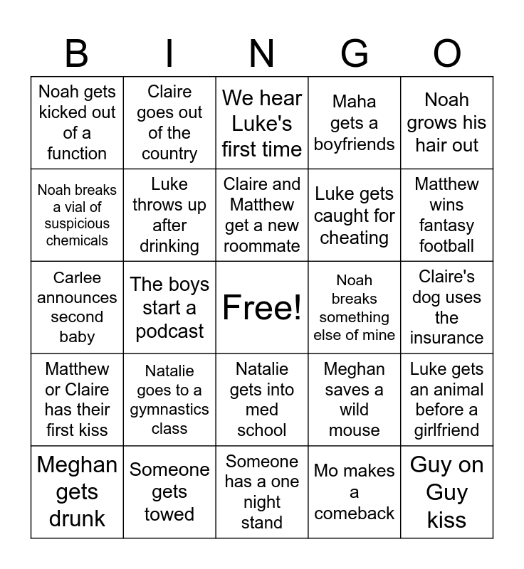 This bingo card has a free space and 24 words: Natalie goes to a gymnastics class, Someone gets towed, Claire and Matthew get a new roommate, Meghan gets drunk, Noah grows his hair out, Noah gets kicked out of a function, Noah breaks a vial of suspicious chemicals, Claire goes out of the country, Noah breaks something else of mine, Natalie gets into med school, Luke gets caught for cheating, Carlee announces second baby, Meghan saves a wild mouse, Luke gets an animal before a girlfriend, Luke throws up after drinking, Mo makes a comeback, Claire's dog uses the insurance, We hear Luke's first time, Matthew wins fantasy football, The boys start a podcast, Guy on Guy kiss, Matthew or Claire has their first kiss, Maha gets a boyfriends and Someone has a one night stand.