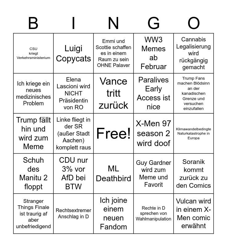 This bingo card has a free space and 24 words: CDU nur 3% vor AfD bei BTW, Rechtsextremer Anschlag in D, Vance tritt zurück, Stranger Things Finale ist traurig af aber unbefriedigend, Cannabis Legalisierung wird rückgängig gemacht, CSU kriegt Verkehrsministerium, Ich kriege ein neues medizinisches Problem, Luigi Copycats, X-Men 97 season 2 wird doof, ML Deathbird, Paralives Early Access ist nice, Trump fällt hin und wird zum Meme, Guy Gardner wird zum Meme und Favorit, Soranik kommt zurück zu den Comics, Elena Lascioni wird NICHT Präsidentin von RO, Rechte in D sprechen von Wahlmanipulation, Klimawandelbedingte Naturkatastrophe in Europa, Emmi und Scottie schaffen es in einem Raum zu sein OHNE Palaver, Trump Fans machen Blödsinn an der kanadischen Grenze und versuchen einzufallen, Linke fliegt in der SR (außer Stadt Aachen) komplett raus, Vulcan wird in einem X-Men comic erwähnt, Schuh des Manitu 2 floppt, WW3 Memes ab Februar and Ich joine einem neuen Fandom.