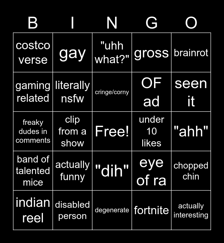 This bingo card has a free space and 24 words: actually funny, disabled person, cringe/corny, indian reel, brainrot, costco verse, gaming related, gay, under 10 likes, "dih", OF ad, freaky dudes in comments, eye of ra, chopped chin, literally nsfw, fortnite, "ahh", "uhh what?", seen it, clip from a show, actually interesting, band of talented mice, gross and degenerate.