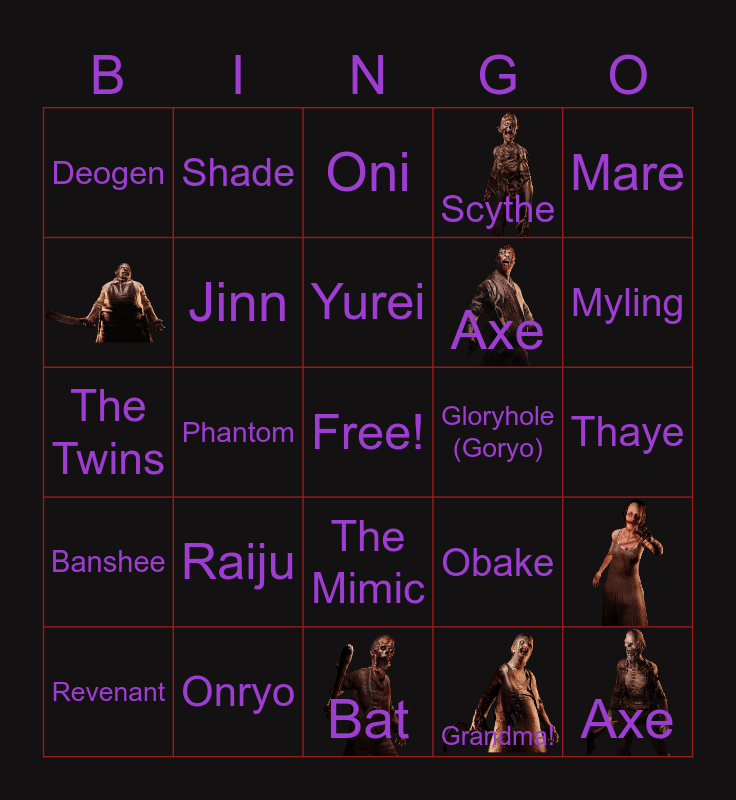 This bingo card has 9 images, a free space and 31 words: Spirit, Wraith, Phantom, Poltergeist, Banshee, Jinn, Mare, Revenant, Shade, Demon, Yurei, Oni, Yokai, Hantu, Gloryhole (Goryo), Myling, Onryo, The Twins, Raiju, Obake, The Mimic, Moroi, Deogen, Thaye, Bat, Axe, Scythe, Axe, OnionHead, Grandma! and Lisa.