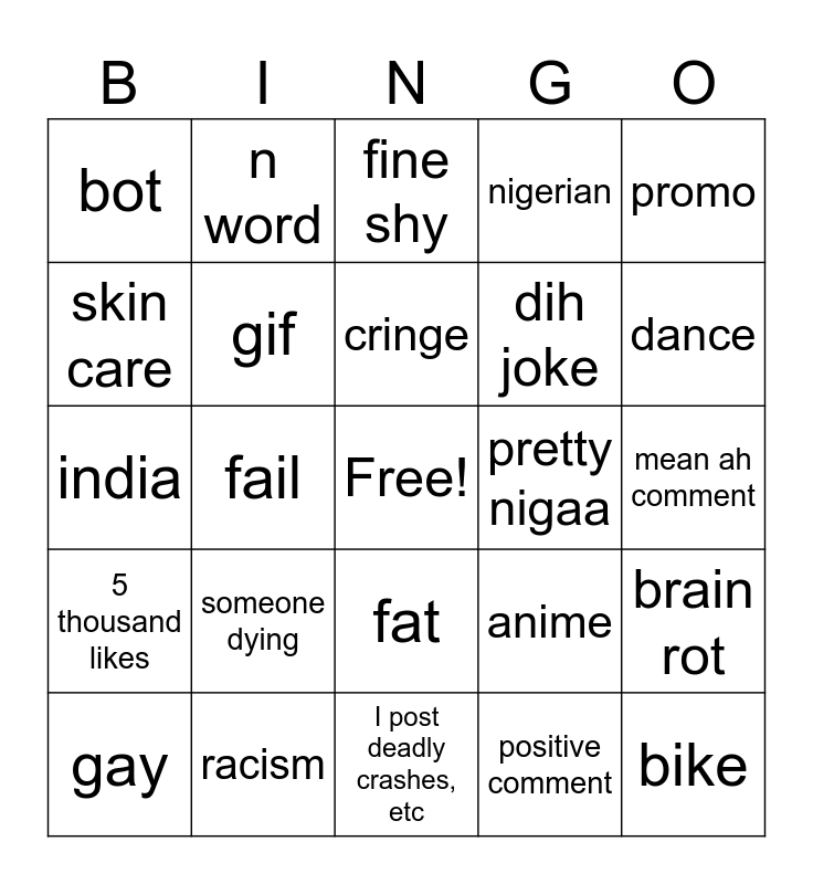 This bingo card has a free space and 24 words: someone dying, racism, cringe, gay, promo, bot, skin care, n word, pretty nigaa, fat, dih joke, india, anime, brain rot, gif, positive comment, mean ah comment, fine shy, dance, fail, bike, 5 thousand likes, nigerian and I post deadly crashes, etc.