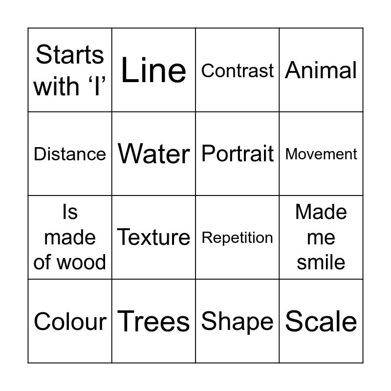 This bingo card has 16 words: Trees, Made me smile, Contrast, Starts with ‘I’, Is made of wood, Line, Repetition, Shape, Distance, Water, Colour, Animal, Texture, Movement, Portrait and Scale.