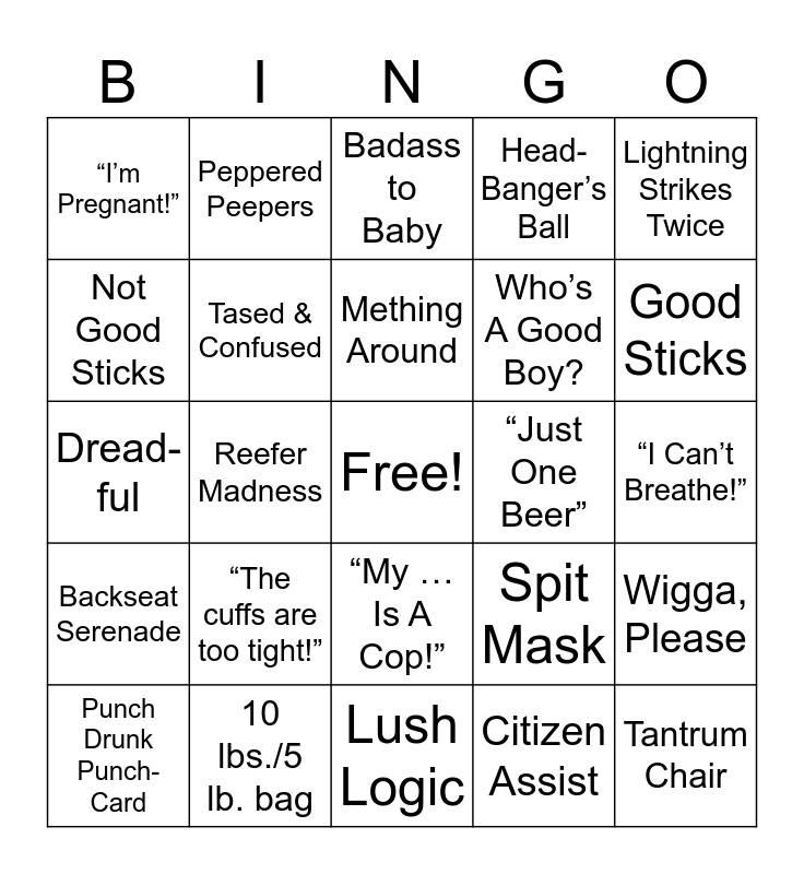 This bingo card has a free space and 24 words: “The cuffs are too tight!”, 10 lbs./5 lb. bag, Mething Around, Punch Drunk Punch-Card, Lightning Strikes Twice, “I’m Pregnant!”, Not Good Sticks, Peppered Peepers, “Just One Beer”, “My … Is A Cop!”, Who’s A Good Boy?, Dread-ful, Spit Mask, Wigga, Please, Tased & Confused, Citizen Assist, “I Can’t Breathe!”, Badass to Baby, Good Sticks, Reefer Madness, Tantrum Chair, Backseat Serenade, Head- Banger’s Ball and Lush Logic.