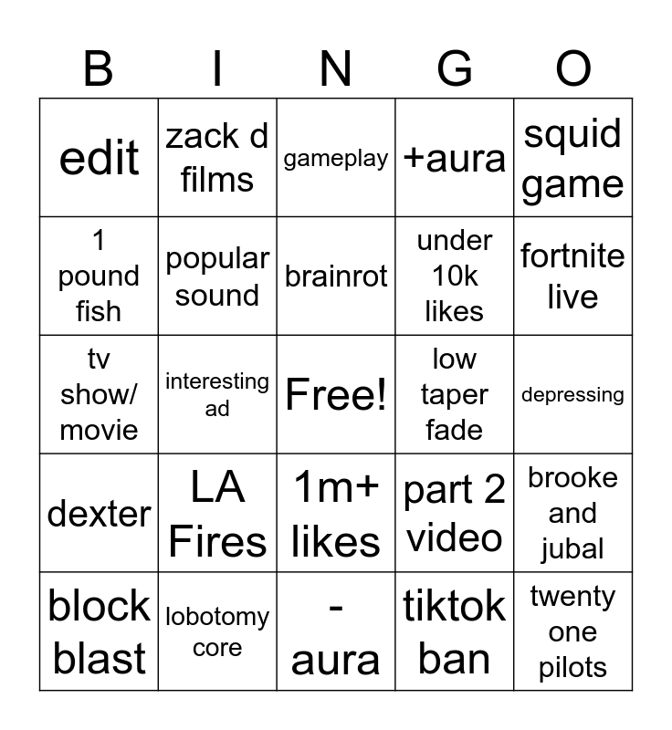 This bingo card has a free space and 24 words: LA Fires, lobotomy core, brainrot, block blast, squid game, edit, 1 pound fish, zack d films, low taper fade, 1m+ likes, under 10k likes, tv show/ movie, part 2 video, brooke and jubal, popular sound, tiktok ban, depressing, gameplay, fortnite live, interesting ad, twenty one pilots, dexter, +aura and -aura.