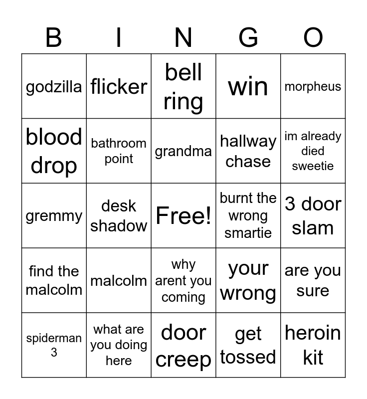 This bingo card has a free space and 24 words: malcolm, what are you doing here, grandma, spiderman 3, morpheus, godzilla, blood drop, flicker, burnt the wrong smartie, why arent you coming, hallway chase, gremmy, your wrong, are you sure, bathroom point, get tossed, 3 door slam, bell ring, im already died sweetie, desk shadow, heroin kit, find the malcolm, win and door creep.