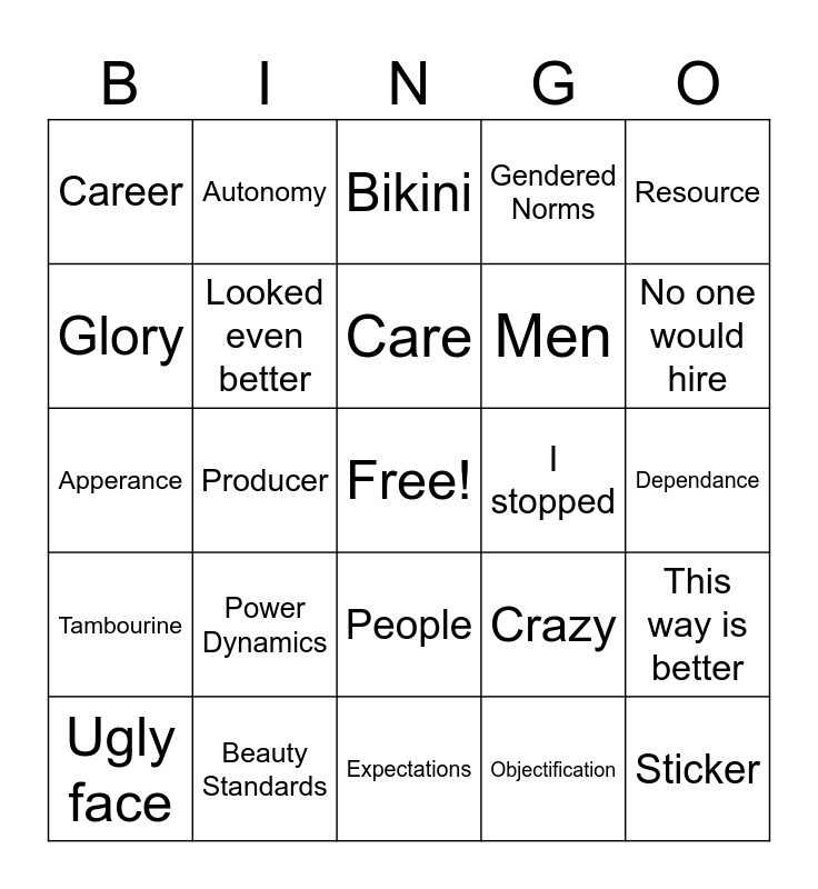 This bingo card has a free space and 28 words: This way is better, Difficult, Men, Objectification, Glory, Bikini, Autonomy, Tambourine, I stopped, Ugly face, Apperance, Gendered Norms, Beauty Standards, Expectations, No one would hire, Gendered Privilege, Power Dynamics, Looked even better, Care, People, Career, Submission, Sticker, Producer, Dependance, Crazy, Resource and Disconnect.
