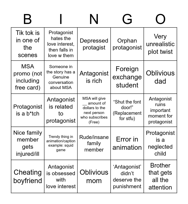 This bingo card has a free space and 24 words: Trendy thing in animation/caption example: squid game, Antagonist is obsessed with love interest, Antagonist is rich, Cheating boyfriend, Very unrealistic plot twist, Tik tok is in one of the scenes, MSA promo (not including free card), Protagonist hates the love interest, then falls in love w them, “Shut the font door!” (Replacement for stfu), Rude/insane family member, Foreign exchange student, Protagonist is a b*tch, Error in animation, Protagonist is a neglected child, Someone in the story has a Genuine conversation about MSA, ‘Antagonist’ didn’t deserve the punishment, Antagonist ruins important moment for protagonist, Depressed protagist, Oblivious dad, Antagonist is related to protagonist, Brother that gets all the attention, Nice family member gets injured/ill, Orphan protagonist and Oblivious mom.