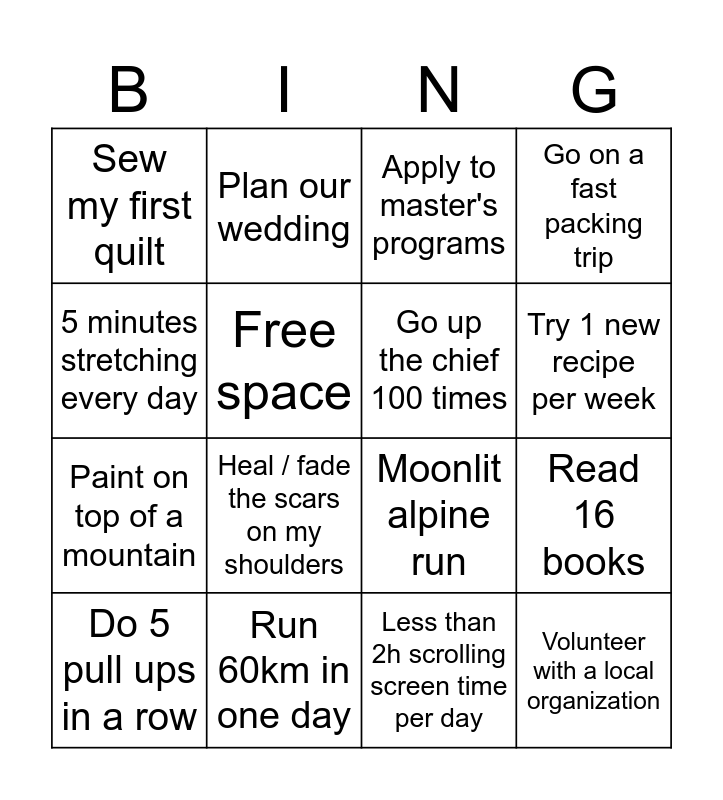 This bingo card has 16 words: Run 60km in one day, Read 16 books, Apply to master's programs, Sew my first quilt, Paint on top of a mountain, Plan our wedding, Moonlit alpine run, Less than 2h scrolling screen time per day, 5 minutes stretching every day, Free space, Do 5 pull ups in a row, Go on a fast packing trip, Heal / fade the scars on my shoulders, Try 1 new recipe per week, Go up the chief 100 times and Volunteer with a local organization.