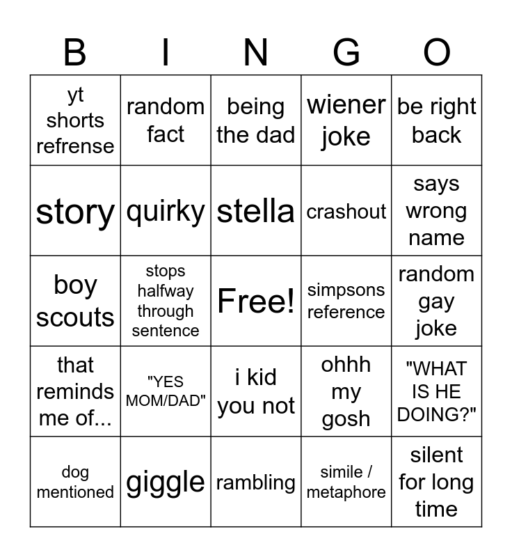 This bingo card has a free space and 24 words: "YES MOM/DAD", giggle, stella, dog mentioned, be right back, yt shorts refrense, story, random fact, simpsons reference, i kid you not, crashout, boy scouts, ohhh my gosh, "WHAT IS HE DOING?", quirky, simile / metaphore, random gay joke, being the dad, says wrong name, stops halfway through sentence, silent for long time, that reminds me of..., wiener joke and rambling.
