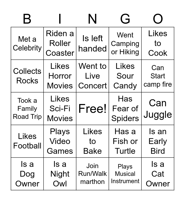 This bingo card has a free space and 24 words: Is a Dog Owner, Plays Video Games, Went to Live Concert, Plays Musical Instrument, Likes to Cook, Met a Celebrity, Riden a Roller Coaster, Is left handed, Has Fear of Spiders, Can Juggle, Took a Family Road Trip, Likes Horror Movies, Has a Fish or Turtle, Is an Early Bird, Collects Rocks, Is a Night Owl, Join Run/Walk marthon, Went Camping or Hiking, Can Start camp fire, Likes Football, Likes Sci-Fi Movies, Likes to Bake, Likes Sour Candy and Is a Cat Owner.