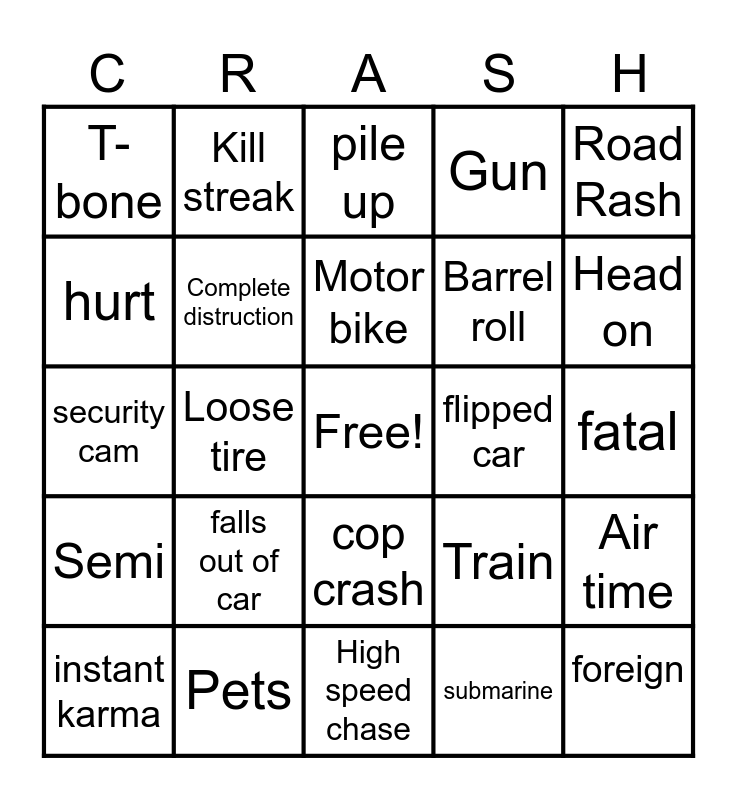 This bingo card has a free space and 37 words: Explosion, lost traction, pole, Complete distruction, Air time, falls out of car, Motor bike, pedestrian, Road Rash, Road Rage, Loose tire, Gun, foreign, fatal, hurt, Semi, hydroplane, pile up, cop crash, flipped car, T-bone, Head on, instant karma, High speed chase, Honda, submarine, Kill streak, Bus, Missing limb, Lawn chair, collateral, Pets, security cam, multiple angles, Train, Barrel roll and Bad luck.