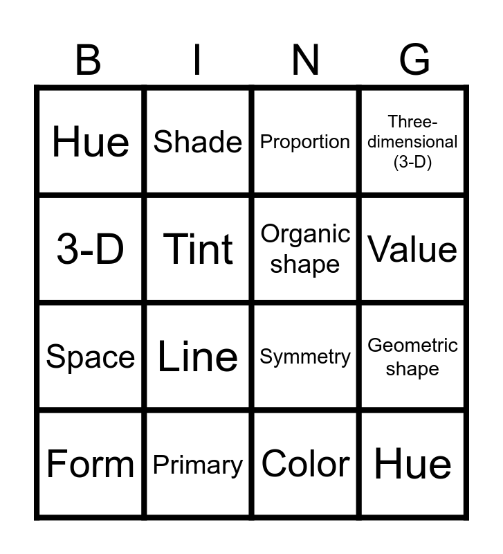 This bingo card has 23 words: Hue, 2-D, Value, Free!, 3-D, Hue, Tint, Shade, Form, Shape, Line, Space, Texture, Saturation, Primary, Secondary, Proportion, Symmetry, Organic shape, Geometric shape, Three-dimensional (3-D), Color and Value Scale.