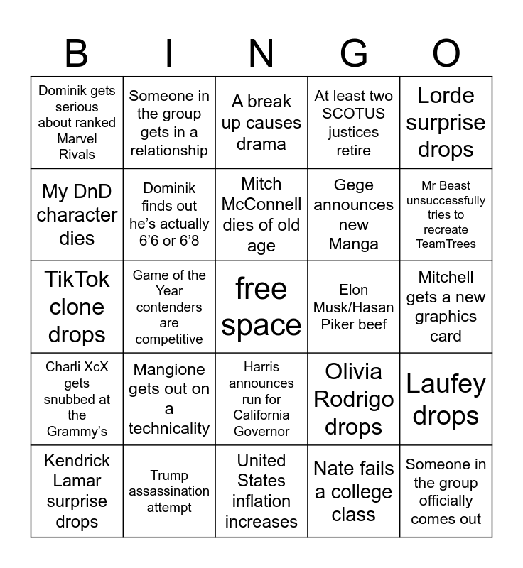 This bingo card has a free space and 24 words: Mangione gets out on a technicality, Trump assassination attempt, Mitch McConnell dies of old age, Kendrick Lamar surprise drops, Lorde surprise drops, Dominik gets serious about ranked Marvel Rivals, My DnD character dies, Someone in the group gets in a relationship, Elon Musk/Hasan Piker beef, Harris announces run for California Governor, Gege announces new Manga, TikTok clone drops, Olivia Rodrigo drops, Laufey drops, Dominik finds out he’s actually 6’6 or 6’8, Nate fails a college class, Mitchell gets a new graphics card, A break up causes drama, Mr Beast unsuccessfully tries to recreate TeamTrees, Game of the Year contenders are competitive, Someone in the group officially comes out, Charli XcX gets snubbed at the Grammy’s, At least two SCOTUS justices retire and United States inflation increases.