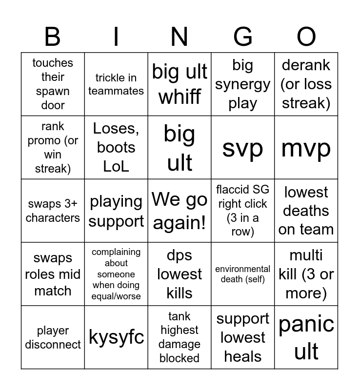 This bingo card has a free space and 24 words: complaining about someone when doing equal/worse, kysyfc, big ult, player disconnect, derank (or loss streak), touches their spawn door, rank promo (or win streak), trickle in teammates, flaccid SG right click (3 in a row), dps lowest kills, svp, swaps 3+ characters, environmental death (self), multi kill (3 or more), Loses, boots LoL, support lowest heals, lowest deaths on team, big ult whiff, mvp, playing support, panic ult, swaps roles mid match, big synergy play and tank highest damage blocked.