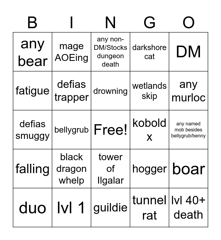 This bingo card has a free space and 36 words: Benny, Rift spawns, defias pillager, defias trapper, hogger, falling, drowning, mogosh orgs, DM, stockades, bellygrub, darkshore cat, horde guard, kobold x, any murloc, any bear, rogue quest, black dragon whelp, lvl 40+ death, any non-DM/Stocks dungeon death, any named mob besides bellygrub/benny, boar, lvl 1, duo, guildie, mage AOEing, defias smuggy, trogg, wetlands skip, fatigue, pvp, stitches, tunnel rat, tower of Ilgalar, Harvest watcher and stockpile.