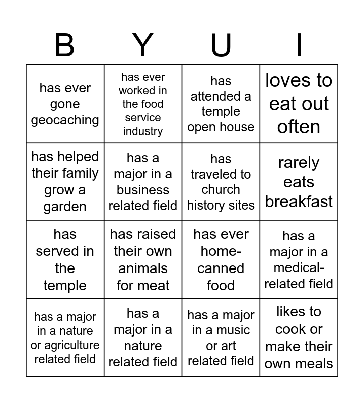 This bingo card has 19 words: has ever home-canned food, has a major in an education related field, has attended a temple open house, likes to cook or make their own meals, has a major in a medical-related field, has helped their family grow a garden, has a major in a music or art related field, has ever gone geocaching, has ever worked in the food service industry, has served in the temple, has raised their own animals for meat, has a major in a business related field, has traveled to church history sites, has a major in a nature related field, has a major in a nature or agriculture related field, has hunted or fished to get meat, loves to eat out often, rarely eats breakfast and is going to graduate with a degree within a year.