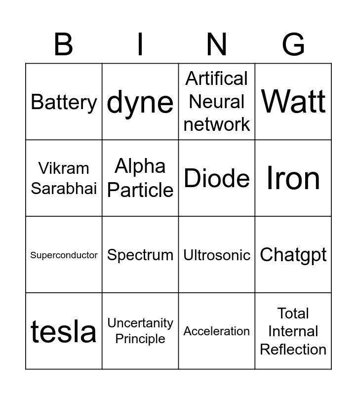 This bingo card has 4 images and 60 words: Infinite, Doppler Effect, dyne, Positron, Iron, Mass energy equivalence, Plasma, Resonance, Acceleration, Vikram Sarabhai, Higgs bosons, Alpha Particle, Chatgpt, Battery, Neutron, Superconductor, Diffraction, Total Internal Reflection, Watt, Photoelectroc effect, Energy Band gap, Black Hole, Frequency, Fission, Ohms law, Inertia, X -ray, Space-time, CPU, Heat, Spectrum, Photon, S. Chandrasekhar, Andromeda, Universal Gravational Constant, Diode, Ultrosonic, Uncertanity Principle, Permitivity of free space, Electron, Gravity, tesla, Young's modulus, Bit, Michalson's Morely Experiment, Entropy, Circuit, Solar Cell, Exclusion Principle, candela, GaN, Polarization, Artifical Neural network, Wavlength, Convex lens, henry, Planck's Constant, Laser, Siemens and Schrodinger.