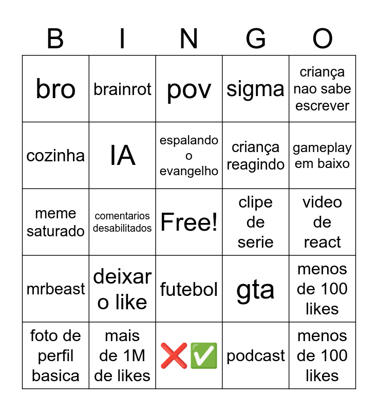 This bingo card has a free space and 24 words: deixar o like, mais de 1M de likes, espalando o evangelho, foto de perfil basica, criança nao sabe escrever, bro, cozinha, brainrot, clipe de serie, futebol, criança reagindo, meme saturado, gta, menos de 100 likes, IA, podcast, video de react, pov, gameplay em baixo, comentarios desabilitados, menos de 100 likes, mrbeast, sigma and ❌✅.