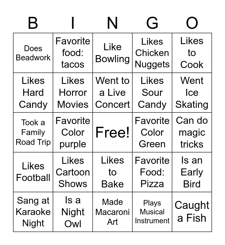 This bingo card has a free space and 24 words: Sang at Karaoke Night, Likes Cartoon Shows, Went to a Live Concert, Plays Musical Instrument, Likes to Cook, Does Beadwork, Favorite food: tacos, Like Bowling, Favorite Color Green, Can do magic tricks, Took a Family Road Trip, Likes Horror Movies, Favorite Food: Pizza, Is an Early Bird, Likes Hard Candy, Is a Night Owl, Made Macaroni Art, Likes Chicken Nuggets, Went Ice Skating, Likes Football, Favorite Color purple, Likes to Bake, Likes Sour Candy and Caught a Fish.