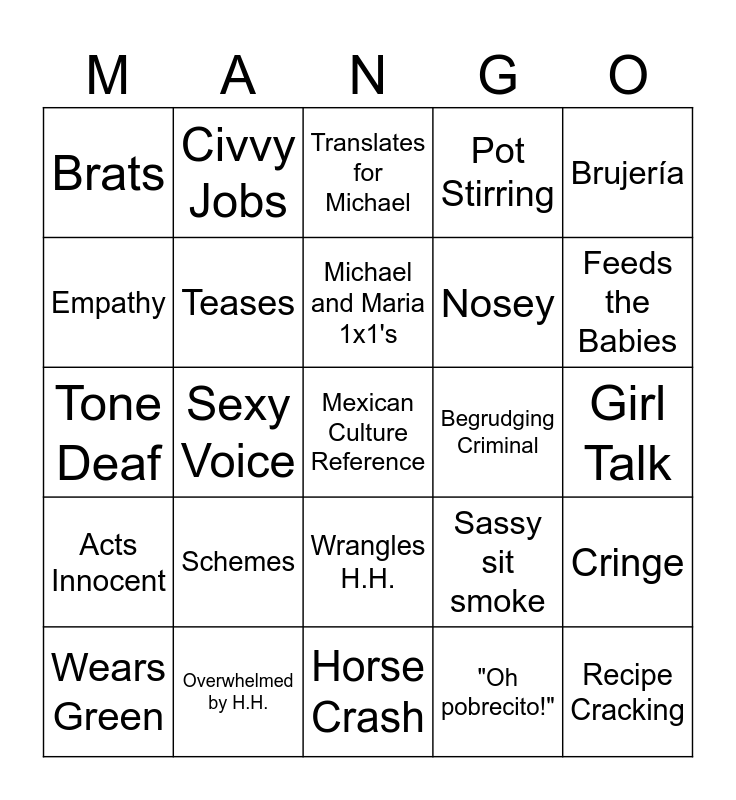This bingo card has a free space and 39 words: Guilt Trips, Chaplins Successfully, Maria Things, Teases, Wears Green, Wrangles H.H., Michael and Maria 1x1's, Poetry, Brujería, Acts Innocent, Sexy Voice, Pot Stirring, Recipe Cracking, Girl Talk, Begrudging Criminal, Schemes, "What do you mean?", Brats, Flirts, Sassy sit smoke, Empathy, Horse Crash, Nosey, Feeds the Babies, Hands on Hips, Disappointed, "Oh my GOD!", Wangewing, Good Cop / Bad Cop, Civvy Jobs, Poster Child, Anonymity, Translates for Michael, Overwhelmed by H.H., "Oh pobrecito!", Burro, Cringe, Tone Deaf and Witch Cackle.