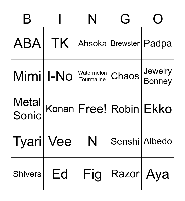 This bingo card has a free space and 24 words: Vee, Ed, Watermelon Tourmaline, Shivers, Padpa, ABA, Mimi, TK, Robin, N, Chaos, Metal Sonic, Senshi, Albedo, I-No, Razor, Ekko, Ahsoka, Jewelry Bonney, Konan, Aya, Tyari, Brewster and Fig.