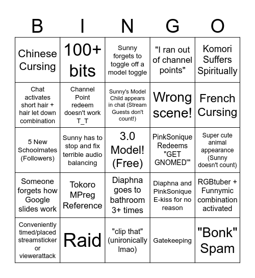 This bingo card has a free space and 33 words: Spanish Cursing, "The Finals", Sunny has to stop and fix terrible audio balancing, 5 Subs, Someone forgets how Google slides work, Channel Point redeem doesn't work T_T, Komori Suffers Spiritually, Conveniently timed/placed streamsticker or viewerattack, 100+ bits, Stream Crashes, Sunny's Model Child appears in chat (Stream Guests don't count!), Sunny forgets to toggle off a model toggle, Forgot to Unmute, "Fishussy", PinkSonique Redeems "GET GNOMED'", French Cursing, Raid, 5 New Schoolmates (Followers), Tokoro MPreg Reference, Diaphna and PinkSonique E-kiss for no reason, Diaphna goes to bathroom 3+ times, Stream temporarily becomes a musical, Chinese Cursing, Super cute animal appearance (Sunny doesn't count), "clip that"(unironically lmao), "Bonk" Spam, "I ran out of channel points", Wrong scene!, Chat activates short hair + hair let down combination, RGBtuber + Funnymic combination activated, Gaslighting, Gatekeeping and Girlbossing.