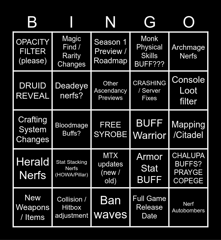 This bingo card has a free space and 24 words: Stat Stacking Nerfs (HOWA/Pillar), Collision / Hitbox adjustment, Other Ascendancy Previews, New Weapons / Items, Archmage Nerfs, OPACITY FILTER (please), DRUID REVEAL, Magic Find / Rarity Changes, BUFF Warrior, MTX updates (new / old), CRASHING / Server Fixes, Crafting System Changes, Armor Stat BUFF, CHALUPA BUFFS? PRAYGE COPEGE, Deadeye nerfs?, Full Game Release Date, Mapping /Citadel, Season 1 Preview / Roadmap, Console Loot filter, Bloodmage Buffs?, Nerf Autobombers, Herald Nerfs, Monk Physical Skills BUFF??? and Ban waves.