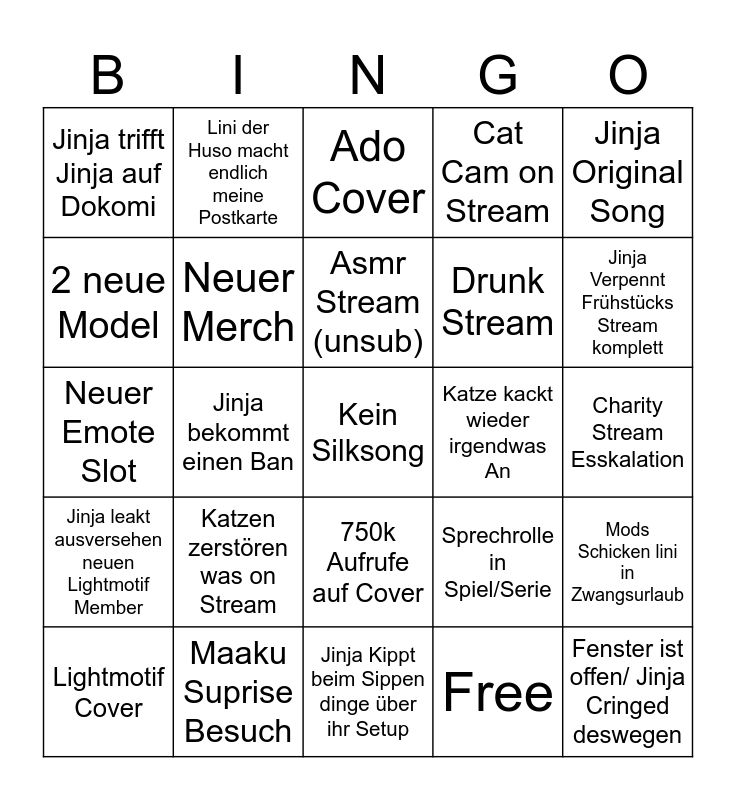 This bingo card has a free space and 24 words: Katzen zerstören was on Stream, Maaku Suprise Besuch, Asmr Stream (unsub), Lightmotif Cover, Jinja Original Song, Jinja trifft Jinja auf Dokomi, 2 neue Model, Lini der Huso macht endlich meine Postkarte, Katze kackt wieder irgendwas An, 750k Aufrufe auf Cover, Drunk Stream, Neuer Emote Slot, Sprechrolle in Spiel/Serie, Mods Schicken lini in Zwangsurlaub, Neuer Merch, Free, Charity Stream Esskalation, Ado Cover, Jinja Verpennt Frühstücks Stream komplett, Jinja bekommt einen Ban, Fenster ist offen/ Jinja Cringed deswegen, Jinja leakt ausversehen neuen Lightmotif Member, Cat Cam on Stream and Jinja Kippt beim Sippen dinge über ihr Setup.