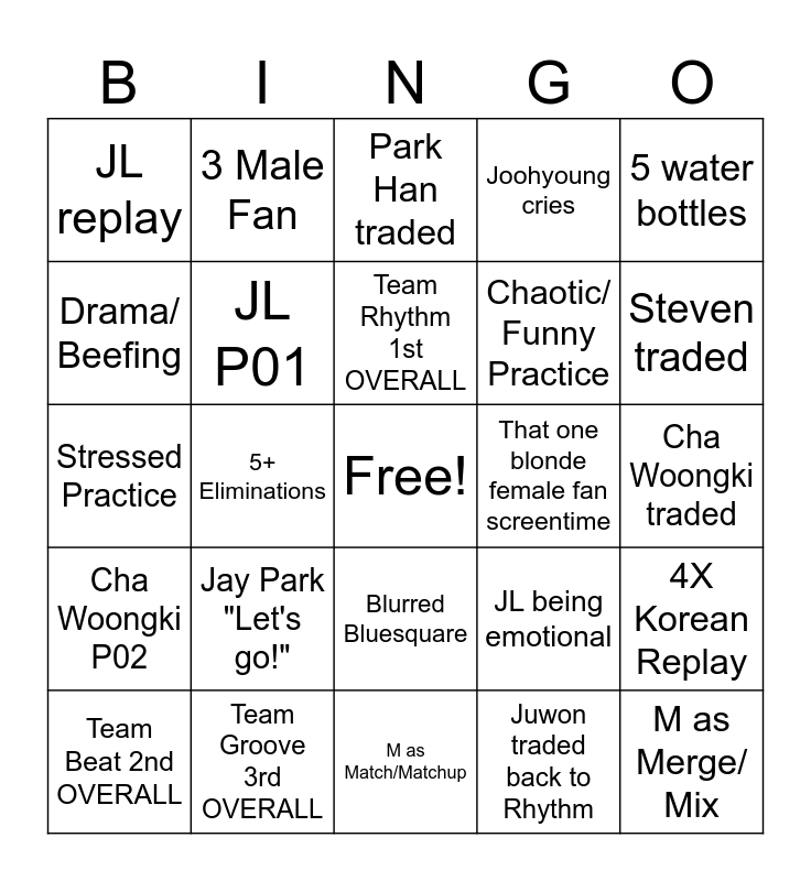 This bingo card has a free space and 24 words: Jay Park "Let's go!", Team Groove 3rd OVERALL, Team Rhythm 1st OVERALL, Team Beat 2nd OVERALL, 5 water bottles, JL replay, Drama/ Beefing, 3 Male Fan, That one blonde female fan screentime, Blurred Bluesquare, Chaotic/ Funny Practice, Stressed Practice, JL being emotional, 4X Korean Replay, JL P01, Juwon traded back to Rhythm, Cha Woongki traded, Park Han traded, Steven traded, 5+ Eliminations, M as Merge/ Mix, Cha Woongki P02, Joohyoung cries and M as Match/Matchup.