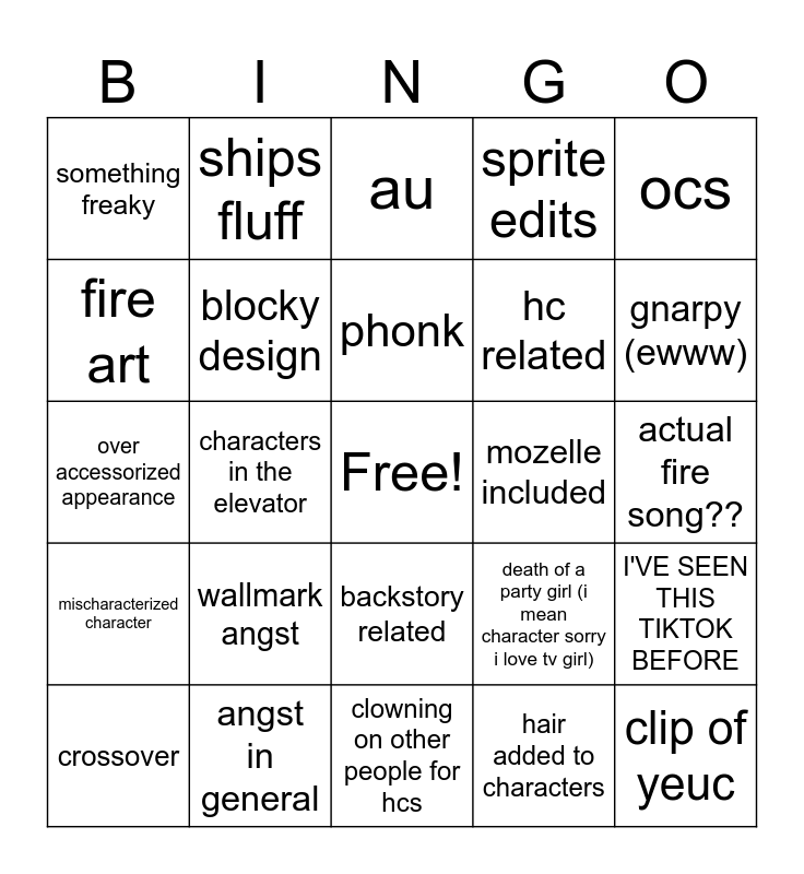 This bingo card has a free space and 24 words: wallmark angst, angst in general, phonk, crossover, ocs, something freaky, fire art, ships fluff, mozelle included, backstory related, hc related, over accessorized appearance, death of a party girl (i mean character sorry i love tv girl), I'VE SEEN THIS TIKTOK BEFORE, blocky design, hair added to characters, actual fire song??, au, gnarpy (ewww), characters in the elevator, clip of yeuc, mischaracterized character, sprite edits and clowning on other people for hcs.