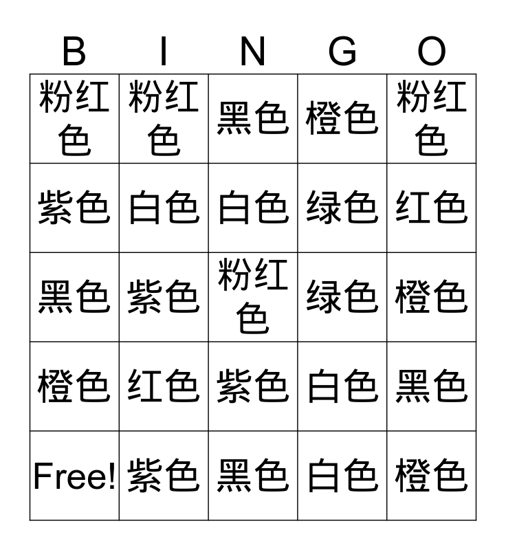 This bingo card has 29 words: Free!, 绿色, 紫色, 橙色, 粉红色, 黑色, 白色, 红色, 绿色, 紫色, 橙色, 粉红色, 黑色, 白色, 红色, 绿色, 紫色, 橙色, 粉红色, 黑色, 白色, 红色, 绿色, 紫色, 橙色, 粉红色, 黑色, 白色 and 红色.