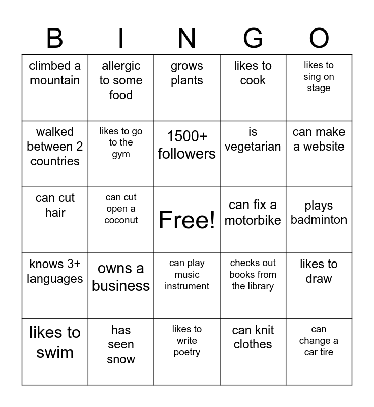 This bingo card has a free space and 24 words: owns a business, has seen snow, 1500+ followers, likes to swim, likes to sing on stage, climbed a mountain, walked between 2 countries, allergic to some food, can fix a motorbike, can play music instrument, is vegetarian, can cut hair, checks out books from the library, likes to draw, likes to go to the gym, can knit clothes, plays badminton, grows plants, can make a website, can cut open a coconut, can change a car tire, knows 3+ languages, likes to cook and likes to write poetry.