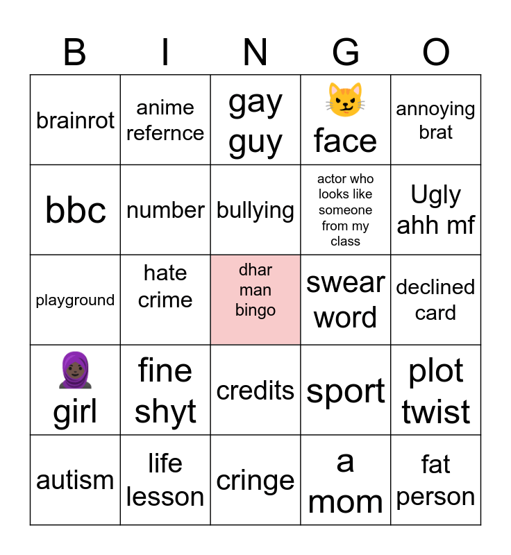 This bingo card has a free space and 24 words: fine shyt, life lesson, bullying, autism, annoying brat, brainrot, bbc, anime refernce, swear word, credits, actor who looks like someone from my class, playground, sport, plot twist, number, a mom, declined card, gay guy, Ugly ahh mf, hate crime, fat person, 🧕🏿 girl, 😼 face and cringe.