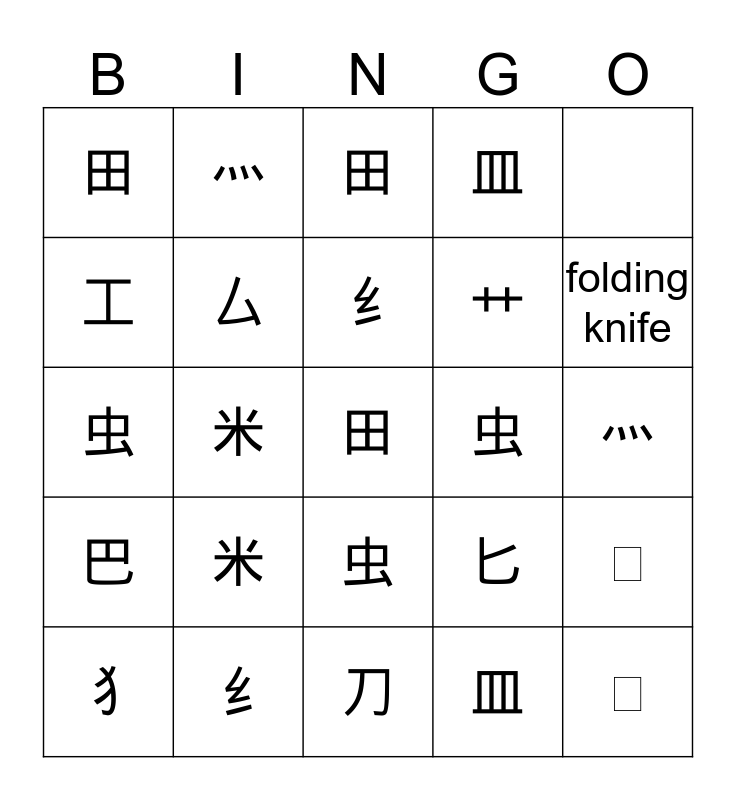 ⚠ This card has duplicate items: 犭 (5), 田 (5), 匕 (5), folding knife (4), 艹 (5), 虫 (5), 厶 (5), 灬 (5), 皿 (5), ⺮ (5), 巴 (5), 纟 (5), 工 (5), 刀 (5), 米 (5)