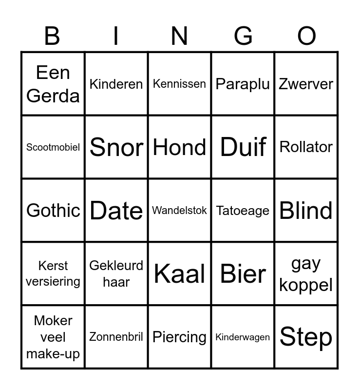 This bingo card has a free space and 24 words: Gekleurd haar, Zonnenbril, Hond, Moker veel make-up, Zwerver, Een Gerda, Scootmobiel, Kinderen, Tatoeage, Kaal, Duif, Gothic, Bier, gay koppel, Snor, Kinderwagen, Blind, Kennissen, Rollator, Date, Step, Kerst versiering, Paraplu and Piercing.