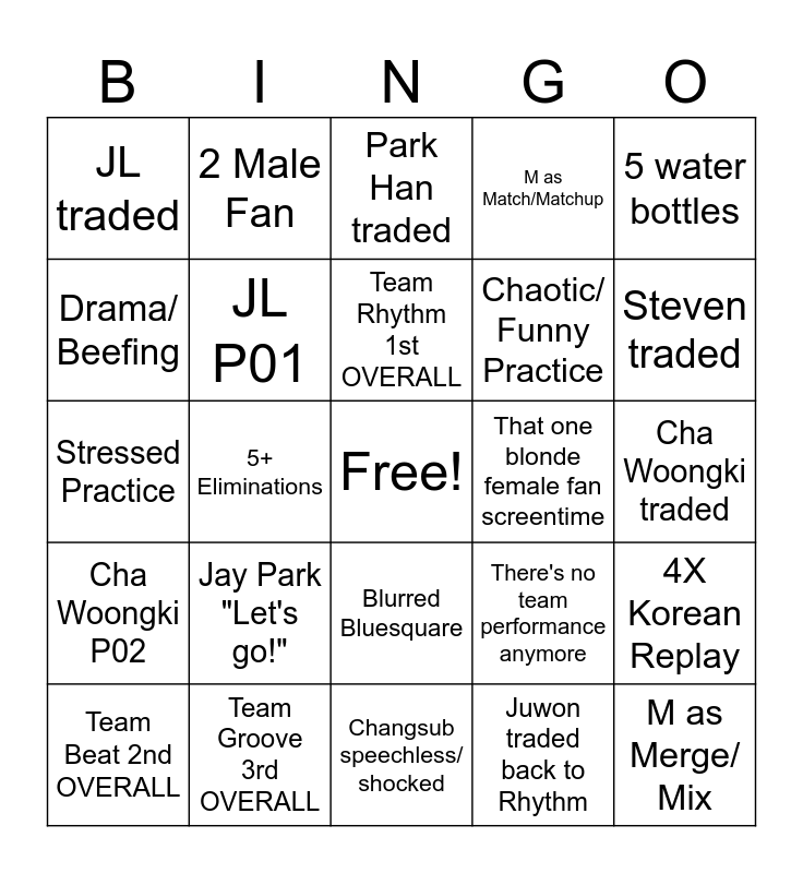 This bingo card has a free space and 24 words: Jay Park "Let's go!", Team Groove 3rd OVERALL, Team Rhythm 1st OVERALL, Team Beat 2nd OVERALL, 5 water bottles, JL traded, Drama/ Beefing, 2 Male Fan, That one blonde female fan screentime, Blurred Bluesquare, Chaotic/ Funny Practice, Stressed Practice, There's no team performance anymore, 4X Korean Replay, JL P01, Juwon traded back to Rhythm, Cha Woongki traded, Park Han traded, Steven traded, 5+ Eliminations, M as Merge/ Mix, Cha Woongki P02, M as Match/Matchup and Changsub speechless/ shocked.