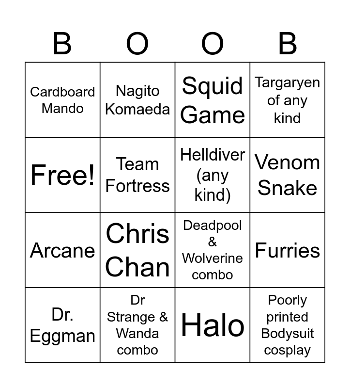 This bingo card has 16 words: Dr Strange & Wanda combo, Furries, Squid Game, Cardboard Mando, Arcane, Nagito Komaeda, Deadpool & Wolverine combo, Halo, Free!, Team Fortress, Dr. Eggman, Targaryen of any kind, Chris Chan, Venom Snake, Helldiver (any kind) and Poorly printed Bodysuit cosplay.