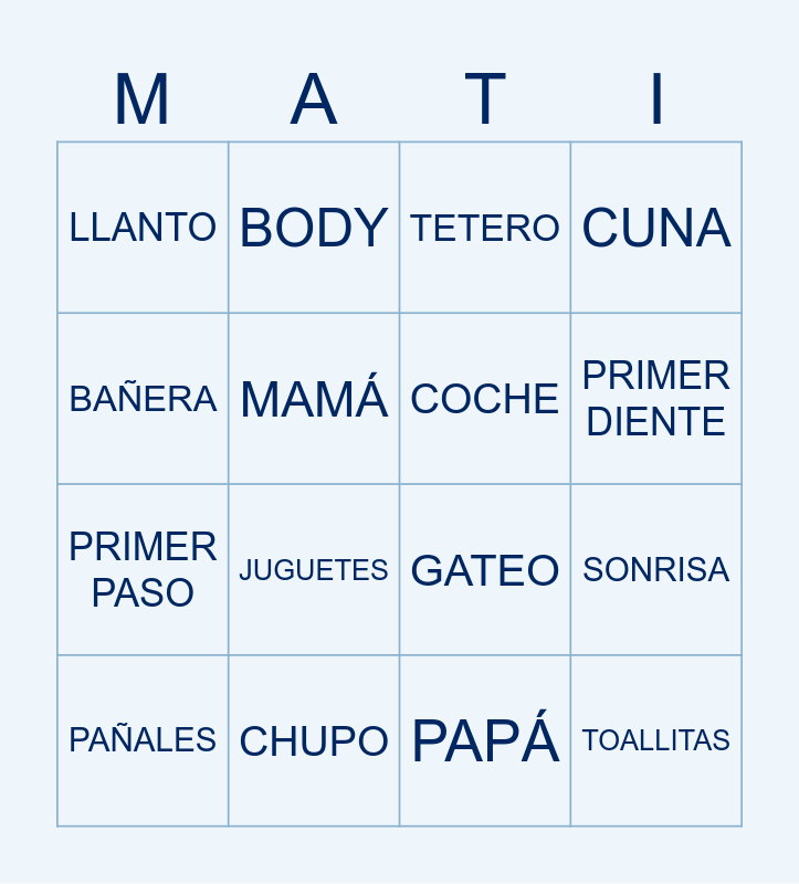 This bingo card has 16 words: PAÑALES, CHUPO, TETERO, CUNA, BAÑERA, BODY, GATEO, SONRISA, LLANTO, MAMÁ, PAPÁ, PRIMER DIENTE, PRIMER PASO, JUGUETES, COCHE and TOALLITAS.