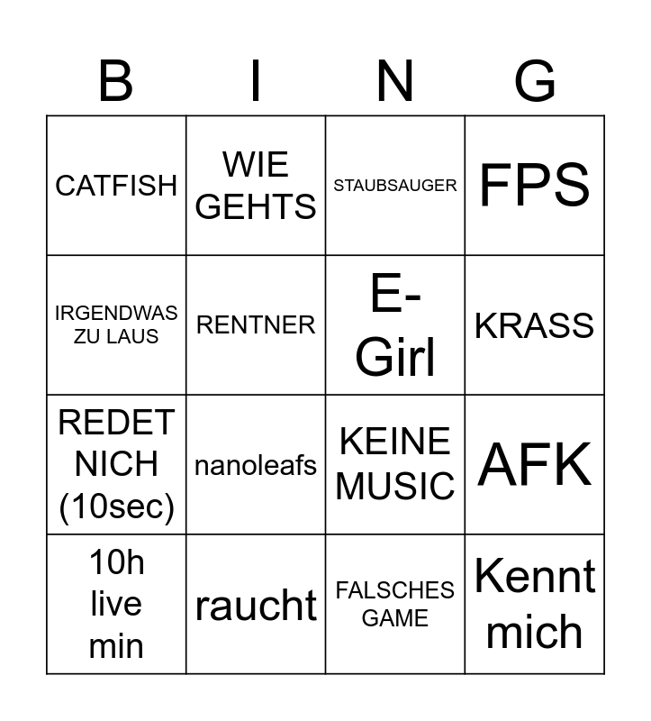 This bingo card has 16 words: raucht, AFK, STAUBSAUGER, CATFISH, REDET NICH (10sec), WIE GEHTS, KEINE MUSIC, FALSCHES GAME, IRGENDWAS ZU LAUS, RENTNER, 10h live min, FPS, nanoleafs, KRASS, E-Girl and Kennt mich.