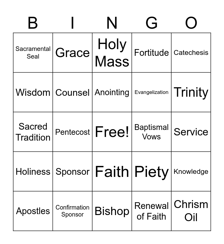 This bingo card has a free space and 48 words: Holy Spirit, Chrism Oil, Sacrament, Bishop, Sponsor, Laying on of Hands, Grace, Gifts of the Holy Spirit, Wisdom, Understanding, Counsel, Fortitude, Knowledge, Piety, Fear of the Lord, Confirmation Name, Anointing, Baptismal Vows, Catechumen, Catechesis, Pentecost, Renewal of Faith, Sacramental Seal, Evangelization, Discernment, Trinity, Apostles, Church, Faith, Holiness, Scripture, Communion, Obedience, Virtue, Confirmation Sponsor, Christ, Eucharis, Service, Creed, Sacramental Grace, Missionary, Covenant, Holy Mass, Holy Water, Sacred Tradition, Prayer, Fruits of the Spirit and Mary.