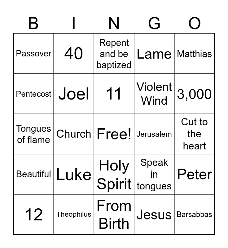 This bingo card has a free space and 24 words: Luke, Theophilus, 11, 12, Matthias, Passover, Pentecost, 40, Jerusalem, Holy Spirit, Violent Wind, Tongues of flame, Speak in tongues, Peter, Joel, Jesus, Cut to the heart, Repent and be baptized, 3,000, Church, Barsabbas, Beautiful, Lame and From Birth.
