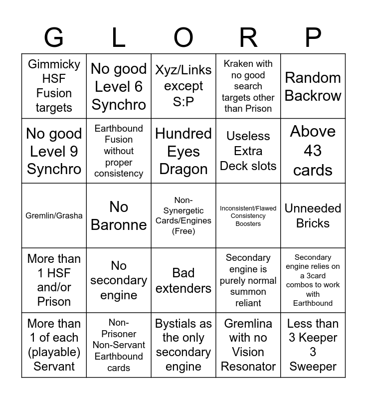This bingo card has a free space and 24 words: No secondary engine, Non-Prisoner Non-Servant Earthbound cards, Hundred Eyes Dragon, More than 1 of each (playable) Servant, Random Backrow, Gimmicky HSF Fusion targets, No good Level 9 Synchro, No good Level 6 Synchro, Inconsistent/Flawed Consistency Boosters, Bad extenders, Useless Extra Deck slots, Gremlin/Grasha, Secondary engine is purely normal summon reliant, Secondary engine relies on a 3card combos to work with Earthbound, Earthbound Fusion without proper consistency, Gremlina with no Vision Resonator, Unneeded Bricks, Xyz/Links except S:P, Above 43 cards, No Baronne, Less than 3 Keeper 3 Sweeper, More than 1 HSF and/or Prison, Kraken with no good search targets other than Prison and Bystials as the only secondary engine.