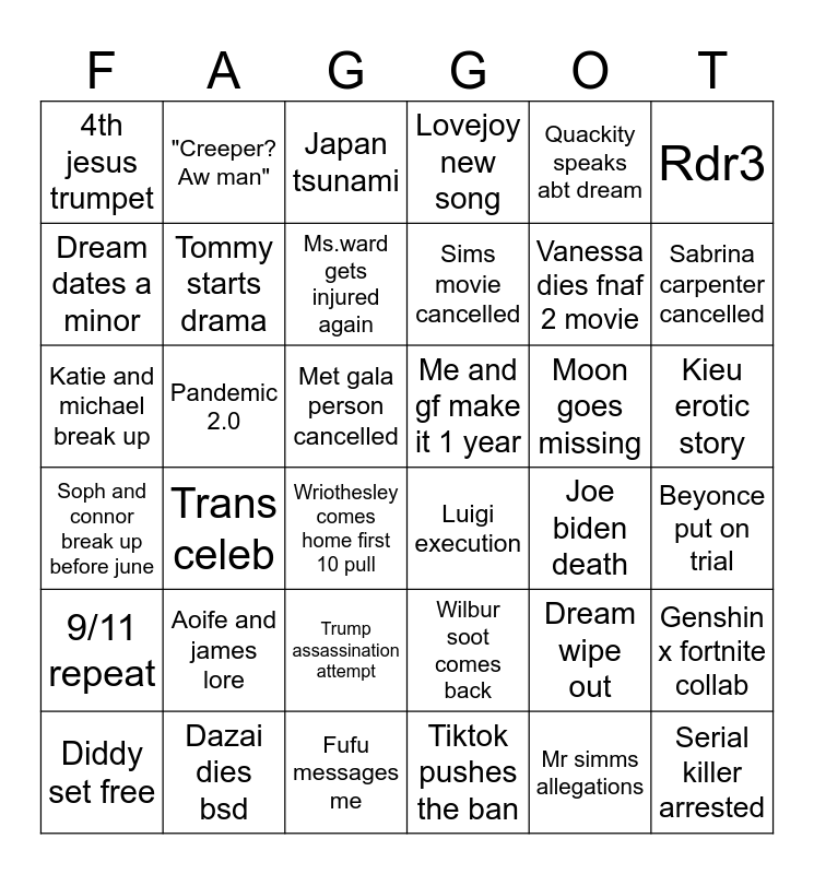 This bingo card has 36 words: Wilbur soot comes back, Trump assassination attempt, Tiktok pushes the ban, Dream dates a minor, Soph and connor break up before june, Me and gf make it 1 year, Tommy starts drama, Fufu messages me, Quackity speaks abt dream, Dream wipe out, Sabrina carpenter cancelled, Lovejoy new song, Genshin x fortnite collab, Pandemic 2.0, Sims movie cancelled, 4th jesus trumpet, 9/11 repeat, Moon goes missing, Katie and michael break up, Japan tsunami, Met gala person cancelled, Trans celeb, Luigi execution, Wriothesley comes home first 10 pull, Joe biden death, "Creeper? Aw man", Vanessa dies fnaf 2 movie, Dazai dies bsd, Ms.ward gets injured again, Rdr3, Serial killer arrested, Diddy set free, Beyonce put on trial, Kieu erotic story, Aoife and james lore and Mr simms allegations.