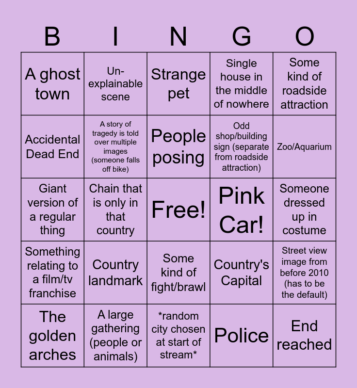 This bingo card has a free space and 24 words: Country landmark, A large gathering (people or animals), People posing, The golden arches, Some kind of roadside attraction, A ghost town, Accidental Dead End, Un-explainable scene, Pink Car!, Some kind of fight/brawl, Odd shop/building sign (separate from roadside attraction), Giant version of a regular thing, Country's Capital, Street view image from before 2010 (has to be the default), A story of tragedy is told over multiple images (someone falls off bike), Police, Someone dressed up in costume, Strange pet, Zoo/Aquarium, Chain that is only in that country, End reached, Something relating to a film/tv franchise, Single house in the middle of nowhere and *random city chosen at start of stream*.
