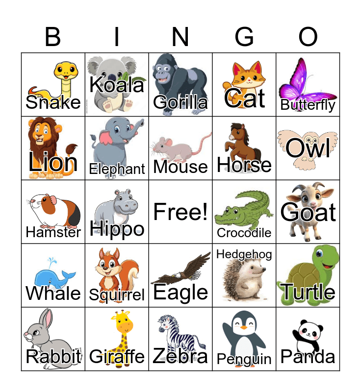 This bingo card has 61 images, a free space and 61 words: Dog, Giraffe, Sheep, Whale, Penguin, Tiger, Elephant, Cow, Horse, Lizard, Cat, Pig, Lion, Octopus, Duck, Snake, Panda, Butterfly, Kangaroo, Mouse, Crocodile, Gorilla, Rabbit, Turtle, Fish, Bear, Spider, Bee, Owl, Caterpillar, Shark, Jellyfish, Dolphin, Chicken, Koala, Deer, Leopard, Hippo, Frog, Hamster, Donkey, Squirrel, Goat, Meerkat, Hedgehog, Camel, Bat, Bird, Fox, Eagle, Zebra, Rhino, Monkey, Ladybird, Snail, Flamingo, Swan, Skunk, Ant, Parrot and Grasshopper.
