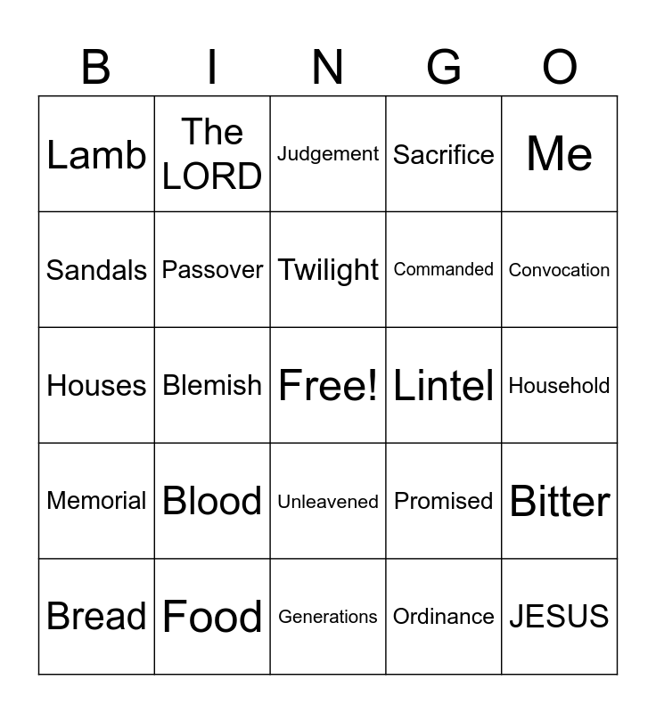 This bingo card has a free space and 24 words: Bread, Blood, Twilight, Ordinance, Me, Lamb, The LORD, Judgement, Lintel, Household, Houses, Passover, Promised, Bitter, Sandals, Food, Generations, Sacrifice, Convocation, Memorial, Blemish, Unleavened, Commanded and JESUS.