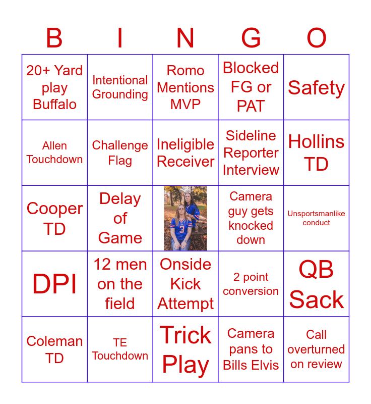 This bingo card has a free space and 24 words: 12 men on the field, TE Touchdown, Ineligible Receiver, Coleman TD, Safety, 20+ Yard play Buffalo, Allen Touchdown, Intentional Grounding, Camera guy gets knocked down, Onside Kick Attempt, Sideline Reporter Interview, Cooper TD, 2 point conversion, QB Sack, Challenge Flag, Camera pans to Bills Elvis, Unsportsmanlike conduct, Romo Mentions MVP, Hollins TD, Delay of Game, Call overturned on review, DPI, Blocked FG or PAT and Trick Play.